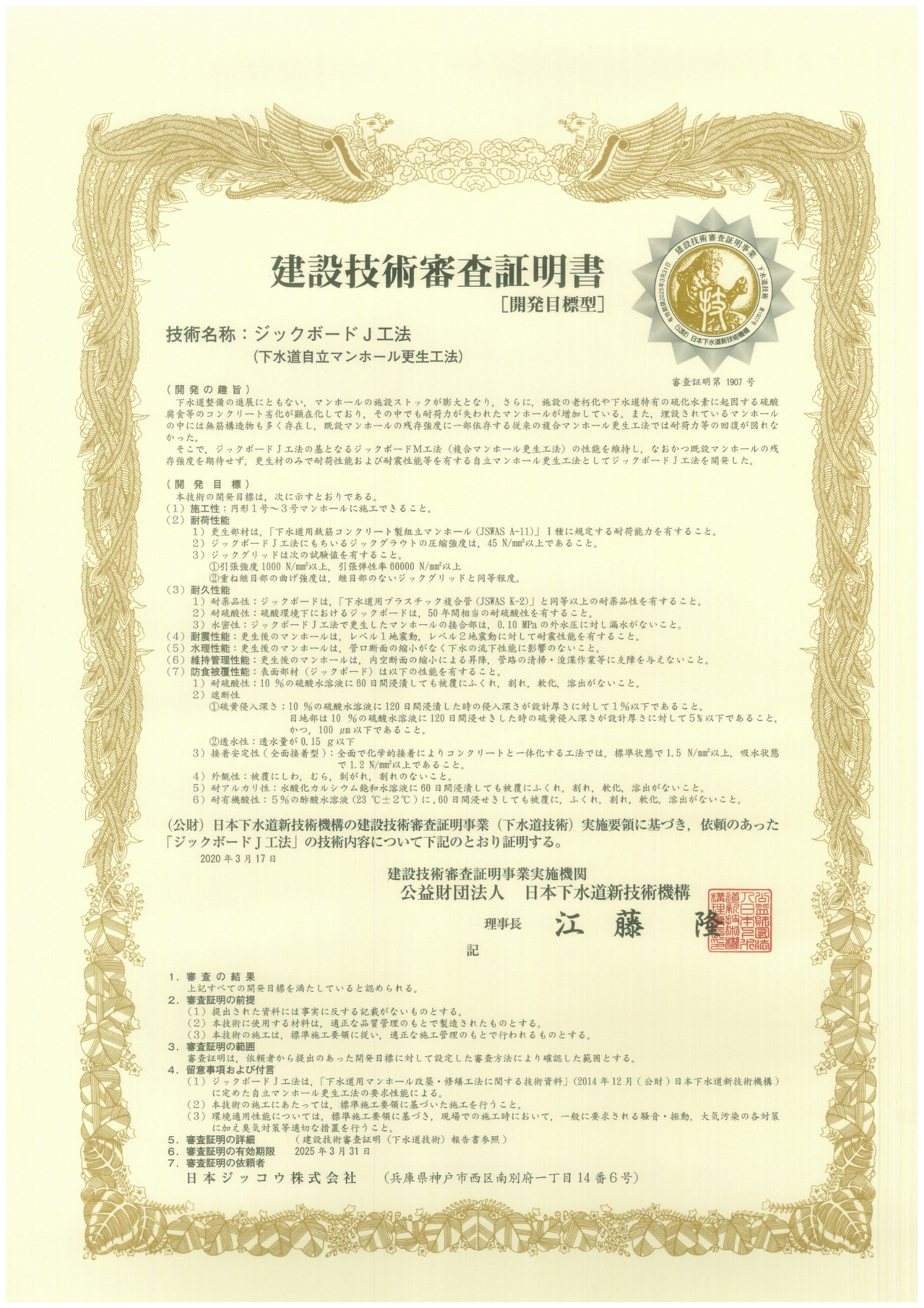 建設技術審査証明(下水道技術 第1907号)を 取得しました。