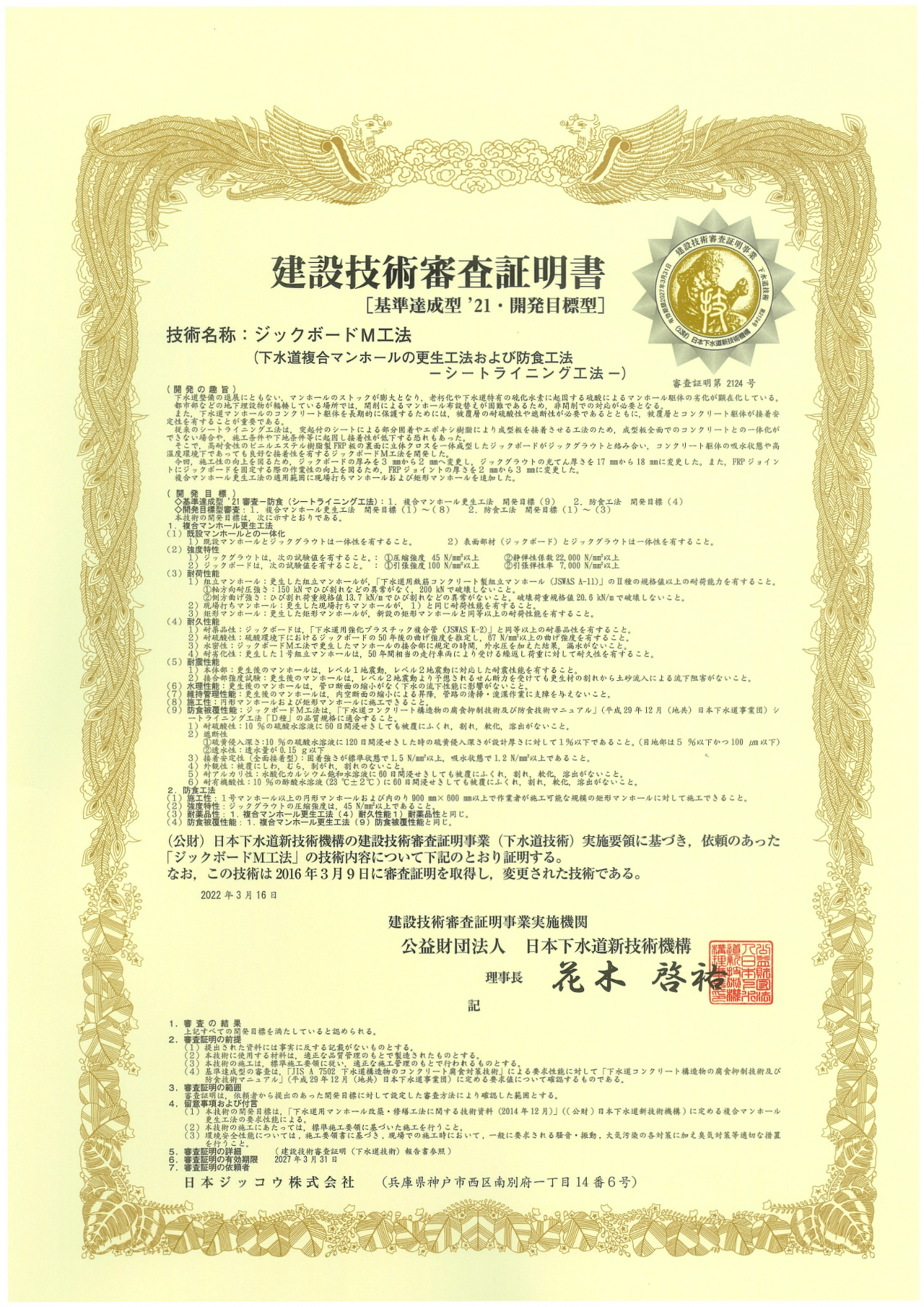建設技術審査証明(下水道技術 第2124号)を取得しました。